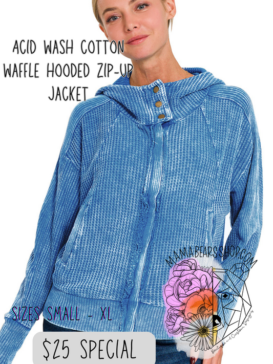 Acid wash cotton waffle hooded zip-up jacket