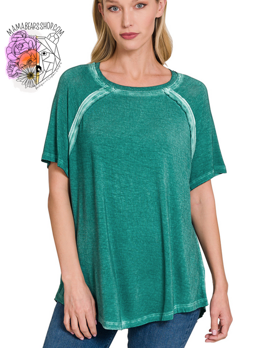 Washed short sleeve boat-neck top w hi-low hem
